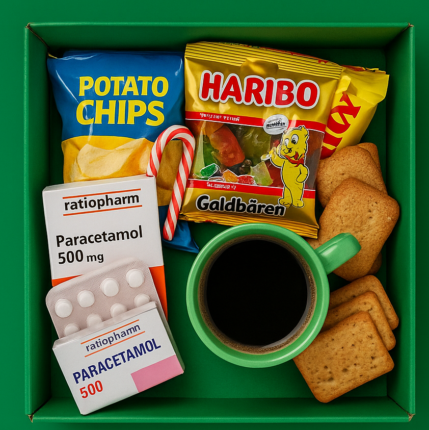 paracetamol, een zakje snoep en chips